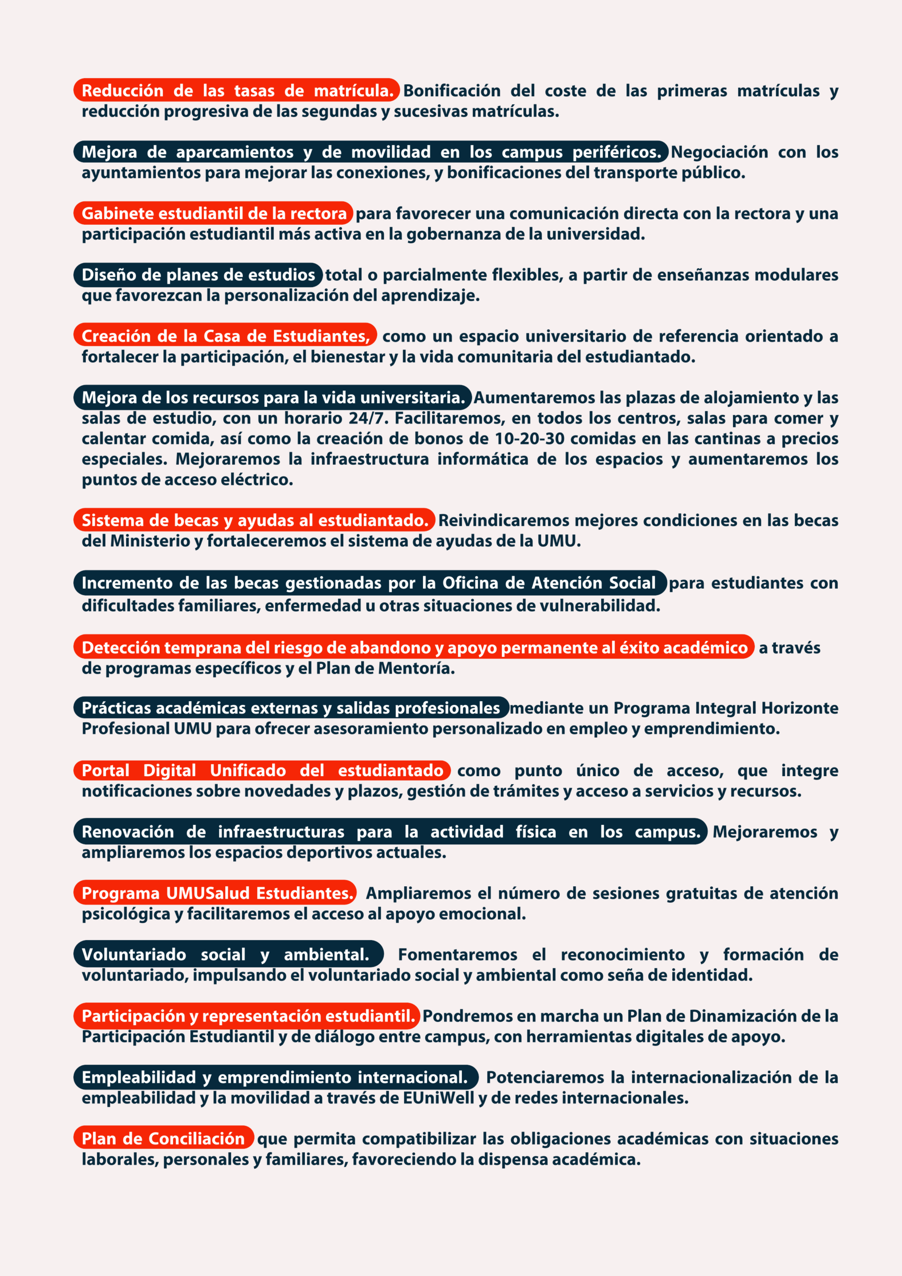 jUntos creaMos futUro es el proyecto con el que doy este paso. Un proyecto colectivo, abierto y realista, construido desde la escucha, el diálogo y el trabajo compartido con estudiantes, PDI y PTGAS. Un proyecto que nace de la convicción de que la Universidad de Murcia solo avanzará de verdad si lo hace unida, con una dirección clara, con participación y con un compromiso compartido con su futuro. El resultado de ese trabajo es una propuesta seria, realista y ambiciosa, estructurada en 11 grandes áreas de actuación, con medidas concretas y un compromiso claro de rendición de cuentas. Queremos impulsar un modelo de gobierno abierto, basado en la transparencia, el seguimiento periódico y la evaluación pública de los compromisos adquiridos. Queremos una universidad que escuche, explique, planifique y cumpla. Nuestro proyecto aborda de forma integral la gobernanza, el estudiantado, el PDI, el PTGAS, la oferta académica, la investigación y la transferencia, las infraestructuras y el patrimonio, la internacionalización, la transformación digital, el bienestar y la salud, y la apertura a la sociedad. Aspiramos a una universidad más humana y eficaz, más participativa y mejor preparada para el futuro.
