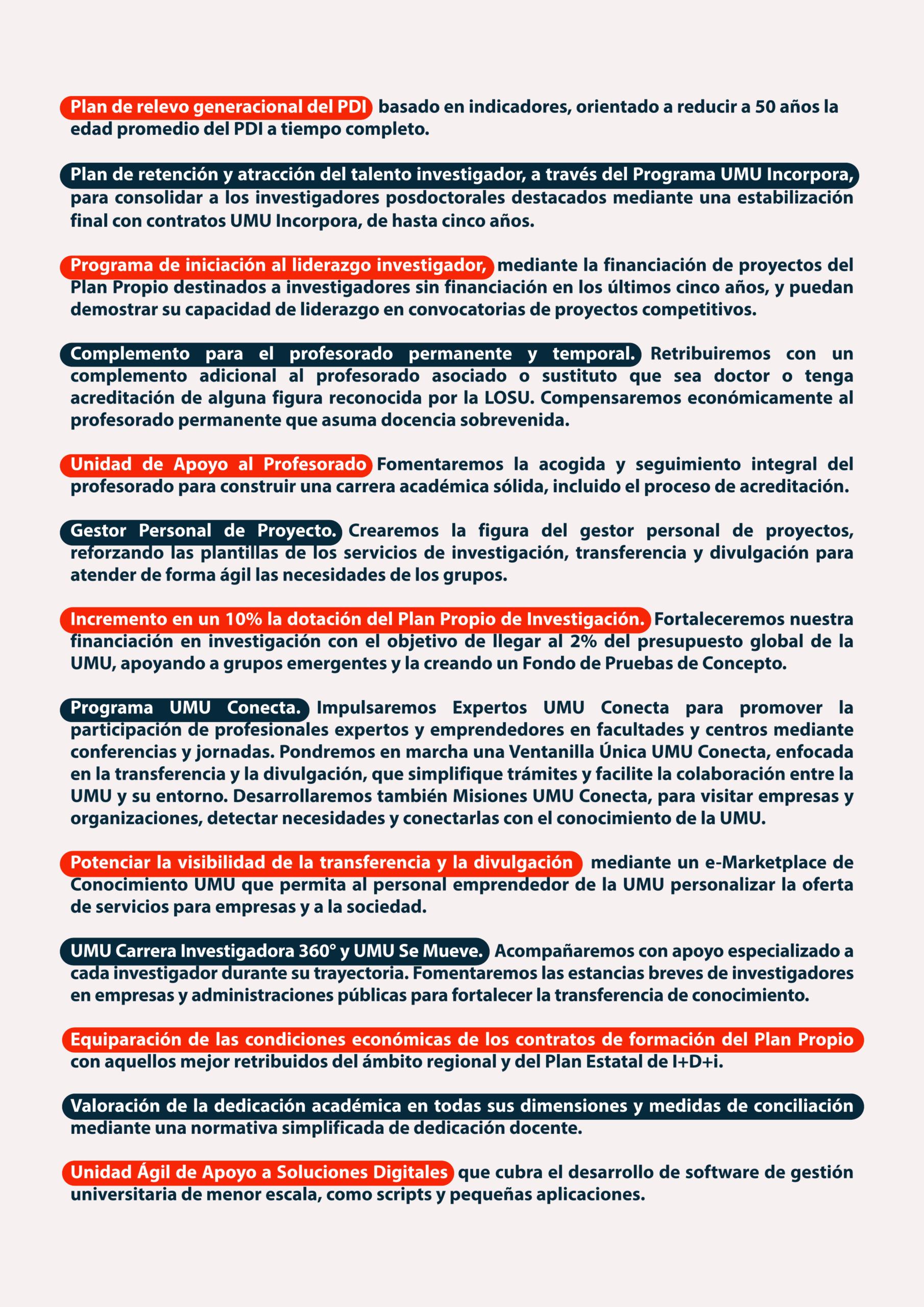 Hoy doy un paso adelante con una convicción firme: impulsar una política ambiciosa, integradora y estratégica de transferencia y divulgación del conocimiento. Me comprometo a simplificar la transferencia mediante una ventanilla única que conecte investigación, divulgación y cultura con la sociedad; a reconocer, apoyar y fomentar la labor de transferencia y divulgación del conocimiento de toda la comunidad universitaria (PDI, PTGAS y estudiantado) mediante incentivos y oportunidades de desarrollo; y a fortalecer un modelo proactivo e internacional que genere impacto real en el entorno y refuerce la colaboración con empresas y administraciones, poniendo mi experiencia al servicio de una Universidad de Murcia más cercana, abierta y conectada, consolidando su cultura de excelencia, vocación de servicio y compromiso con la sociedad.